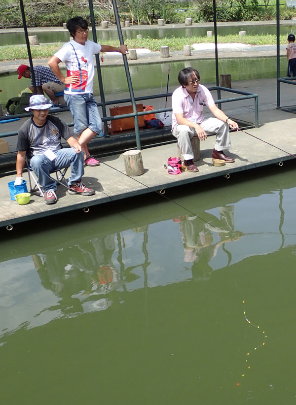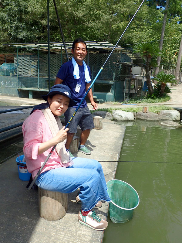 すでに釣りに満足していた僕と黒川商事CEO・黒たんは、余ったエサを手に、一般の方々にエサのサービス。