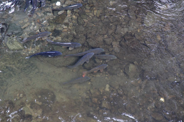 エサ投入開始2分で小魚が山のように集まり、15分でコイもつられて寄ってくる(写真の真ん中らへんにいるの、分かりますでしょうか)。