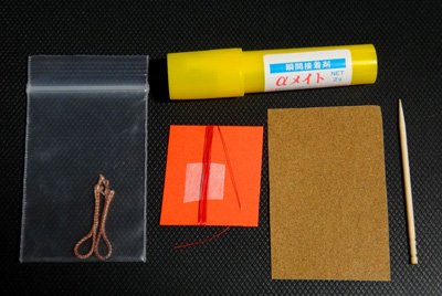 ケブラーの輪っか(2個)、ケブラー糸のほか、紙ヤスリ、つまようじ、瞬間接着剤がセットになっていますので、あとは穂先をカットするニッパーなどがあれば誰にでも改造できます。